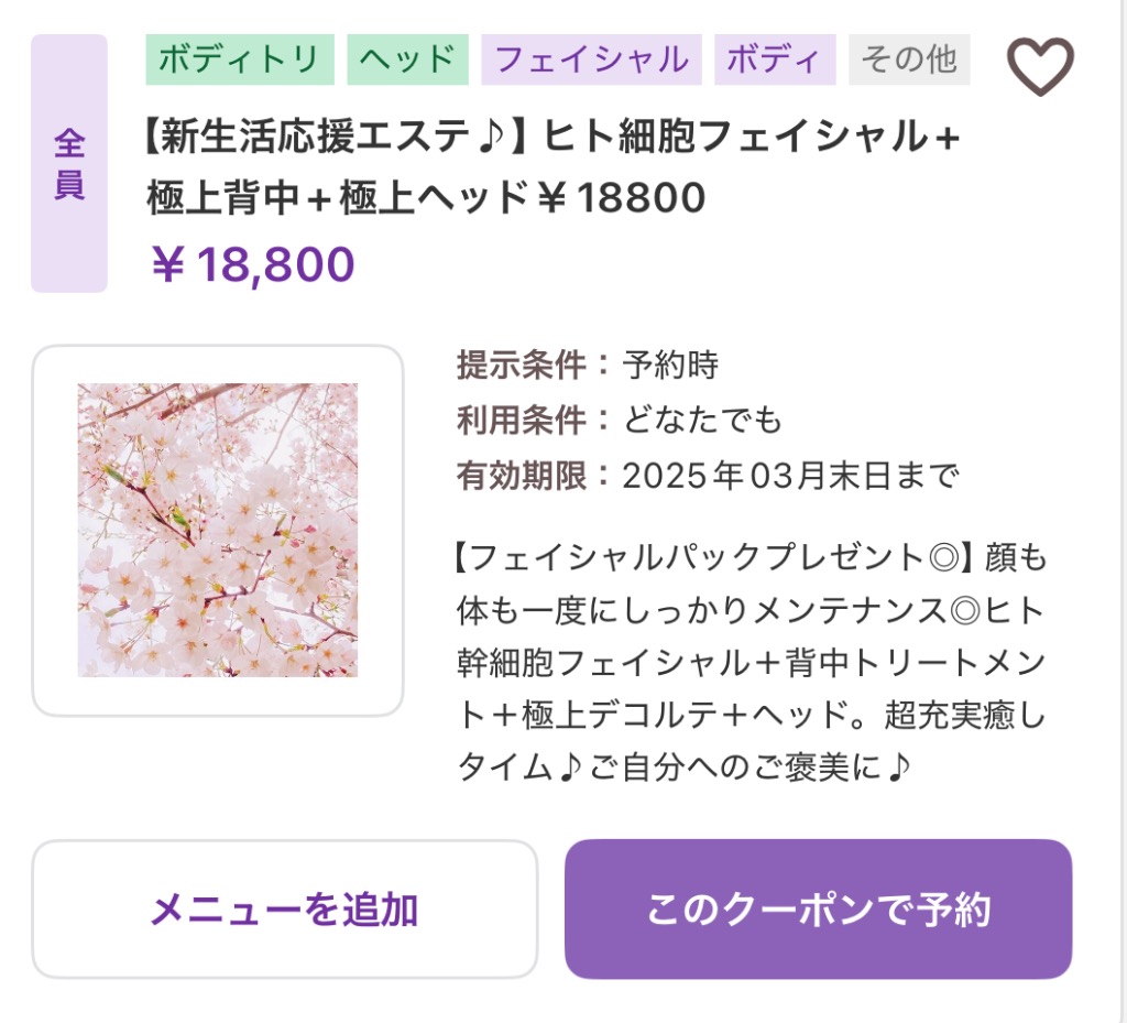 新生活応援エステとして、背中のオイルトリートメントもデコルテや首肩のオイルトリートメントもしっかりさせていただき、フェイシャルはヒト幹細胞培養上清液導入のスペシャルフェイシャルエステの内容を新生活応援エステとしえメニューに入れさせていただいております✨✨